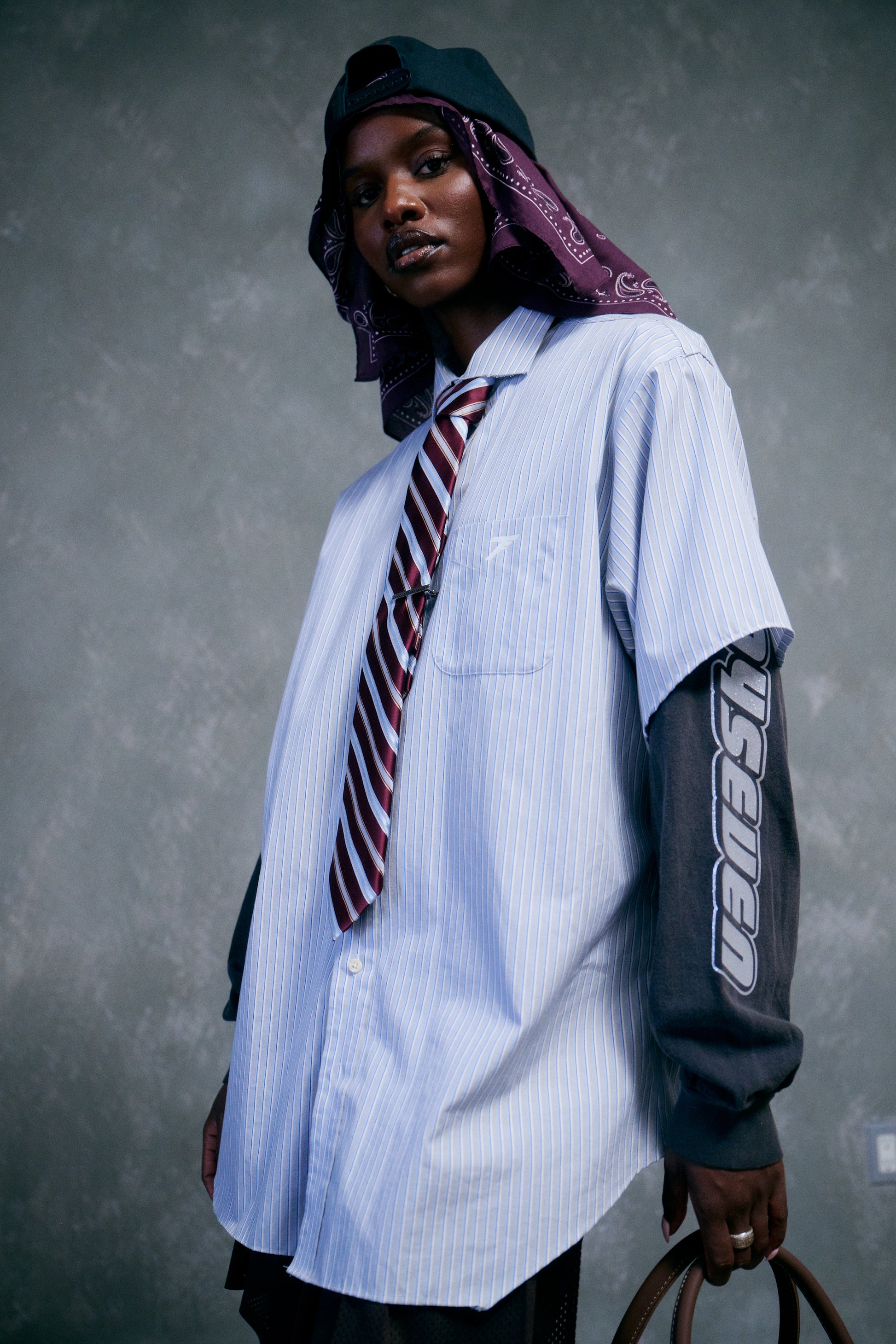 Long sleeve cotton shirt. ANYSEVEN Lambo logo in metallic silver appliqué logos running down both sleeves. ANY7 in metallic silver logo on left chest.